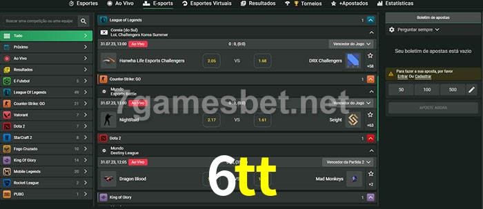 O 6tt oferece uma grande seleção de opções de apostas em e-sports com probabilidades competitivas